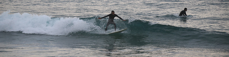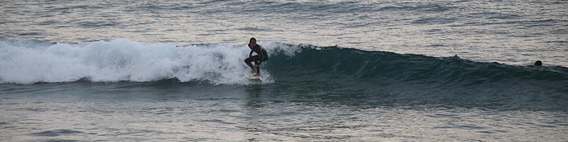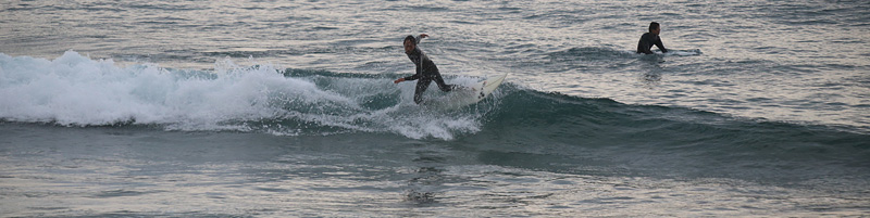 セット間隔長く、入水時はピークでも厚めの波でセットの切れ目から多少横に走って行ける。徐々に潮が引くと掘れた速いブレイクで抜けられない波が増えてきて貸切だったが人も集まってきたので終了