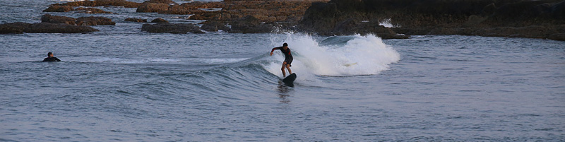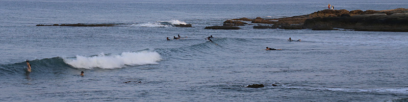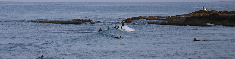 セット間隔長く、厚く入る波はブレイクする位置からでないと乗れず。乗れば上手く繋いで岸近くまでライド可能。