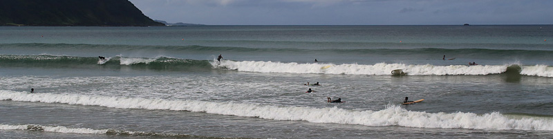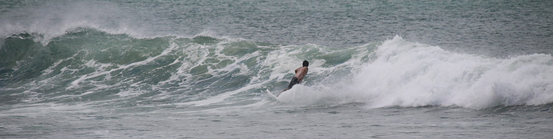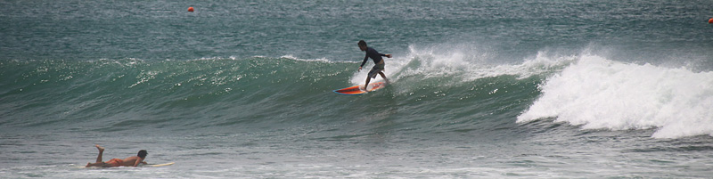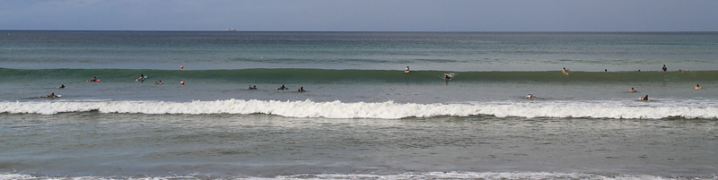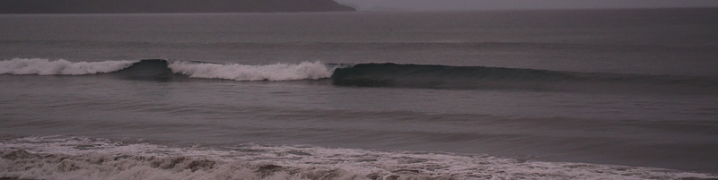 セット間隔長く、波は繋がり気味でピークから乗って上手くつないでインまで乗るか、ワイド気味の波を走ってフィニッシュ可能。次第に潮引きアウトからブレイクするようになり場所よければ100m程走って行ける波も増えた