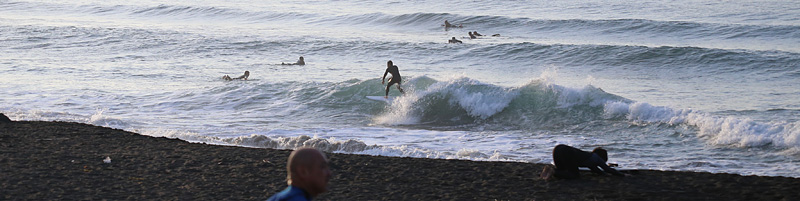 大潮の満潮で波は厚く上手く繋いでいかないとインまで乗れない正面ですが、今回も一人亀田前で入水、セット間隔は長いがミドルから腰程度の波のピークから乗って、上手く繋ぎつつイン寄りで張って来るので走って岸間際まで乗れる波を何本も堪能。しかし、徐々に反応が弱くなり周りに人が入り始めてきたので終了