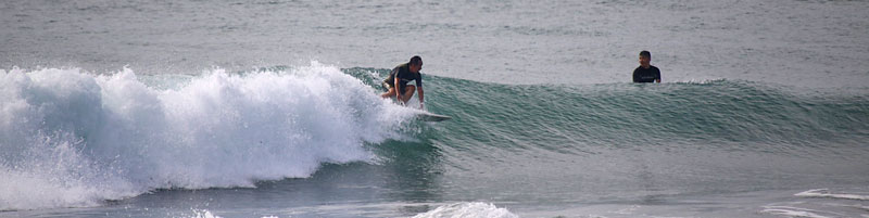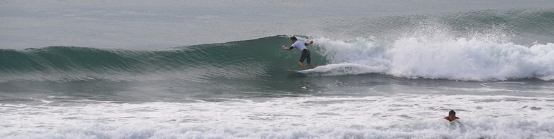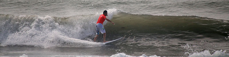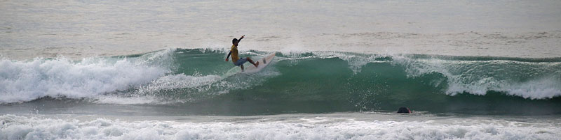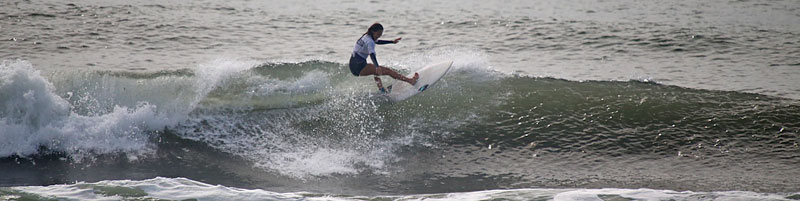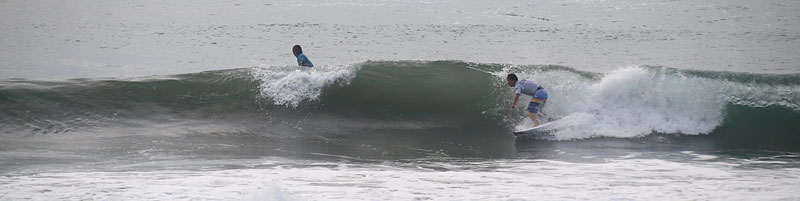 正面は明治大学の大会のため亀田前で入水、セットはつながり気味でミドル付近から急激に掘れて巻く波、上手く切れ目から乗れば岸まで乗れるが波を選ばないと少し走ってダラダラで消えてしまう。潮が引きだすと更にピークが急激に掘れて切れ目から横乗り走り込めるスリルある波